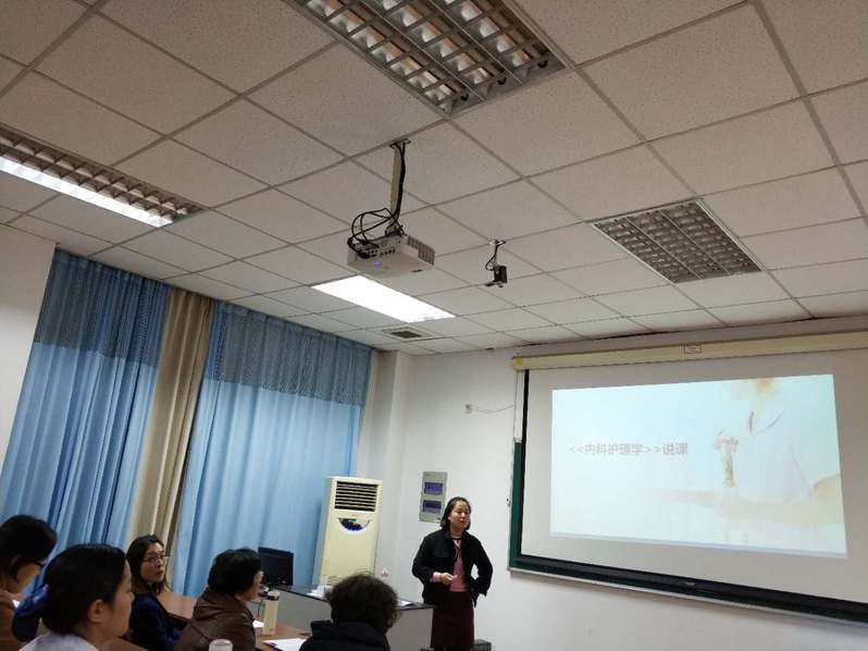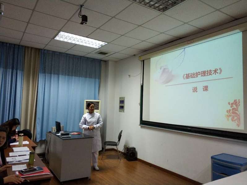 学院综合考量,选派黄欢老师、曹婷老师参加“全国职业院校护理教师技能大赛”。黄欢老师首先介绍了背景,本届比赛共有全国88所职业院校的176名护理专业老师参赛,可谓高手云集。黄欢老师和曹婷老师表示本次参赛重在学习提高,也定会全力以赴,争取赛出最高水平。随后,两位老师进行了10分钟的说课展示,黄欢老师讲授了《内科护理学》,曹婷老师讲授了《基础护理技术》。说课展示过后,依据大赛评分标准,学院老师对两位老师的说课提出了建议,胡鹏飞老师指出黄欢老师的PPT字体颜色需要调整、文字部分也需要进一步精简。赵佩君院长指出曹婷老师准备充分,但是说课过程中还欠缺一些自信,还需多加练习,熟练内容,自信表达。