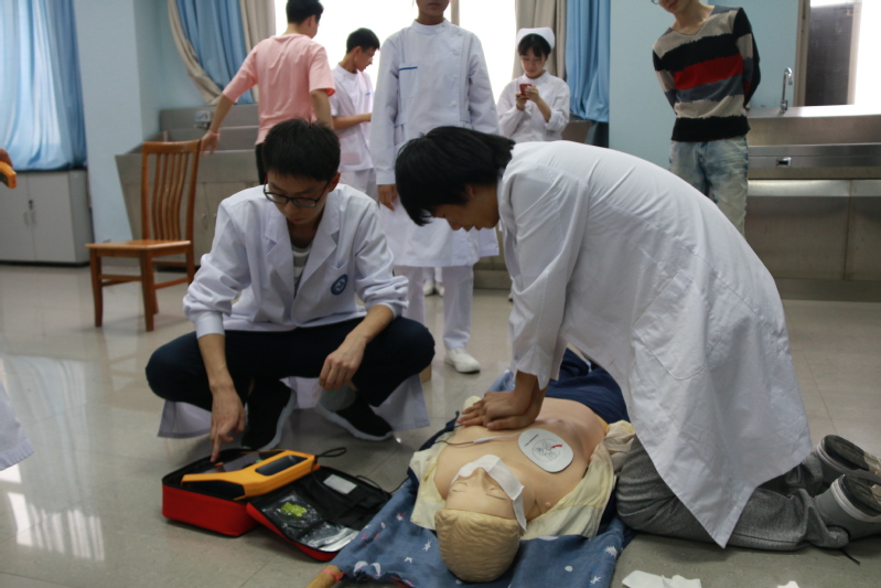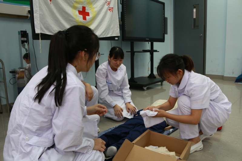 本次比赛由红十字会急救部组织,参赛选手主要为急救部部员和部分护理专业同学,五人为一组组队参赛,队长负责分配任务,其余四人,一号二号队员负责简单的伤痛包扎;三号队员负责送运绷带、纱布、三角巾及除颤仪使用;四号队员负责心肺复苏。一号二号包扎结束后将伤员移到安全地带,留一人看守负责定时放松止血带防止患侧血液循环不好坏死,其余四人负责将心肺复苏成功的患者搬运到安全地带。