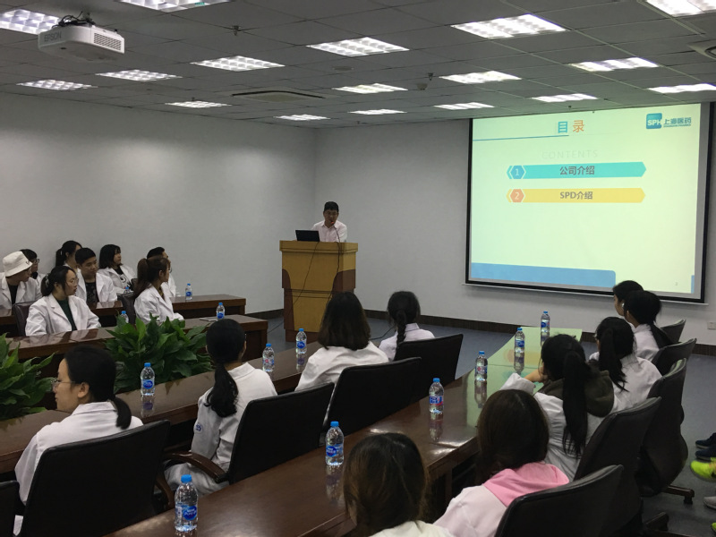 在全体同学到达目的地后,上药企业毛幸华老师,首先对同学们表示了热烈的欢迎。随后,上药物流的施经理,向同学们介绍了医疗SPD供应链管理系列项目。紧接着,施经理播放了以3D透视视角下的整个上药物流,以及全自动的设施设备。