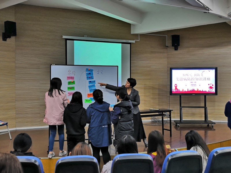 首先,王芳老师向在场的同学们简单介绍了艾滋病的概念以及传播途径,并带领同学进行有趣的头脑风暴,寻找可能传染AIDS的原因。随后,通过“如何正确看待艾滋病”、“判断安全与高危行行为”等小游戏帮助同学们进一步了解艾滋病的预防。在提问环节,王芳老师通过“爱”抛砖引玉提问同学们对于“青春健康”的看法,引导同学们共同探讨了360度的青春,并且鼓励在与异性交往过程中要注重自己的意愿,勇敢直接的表达自己的客观感受,让在场同学受益匪浅。