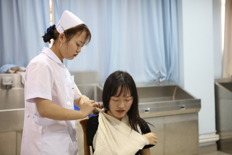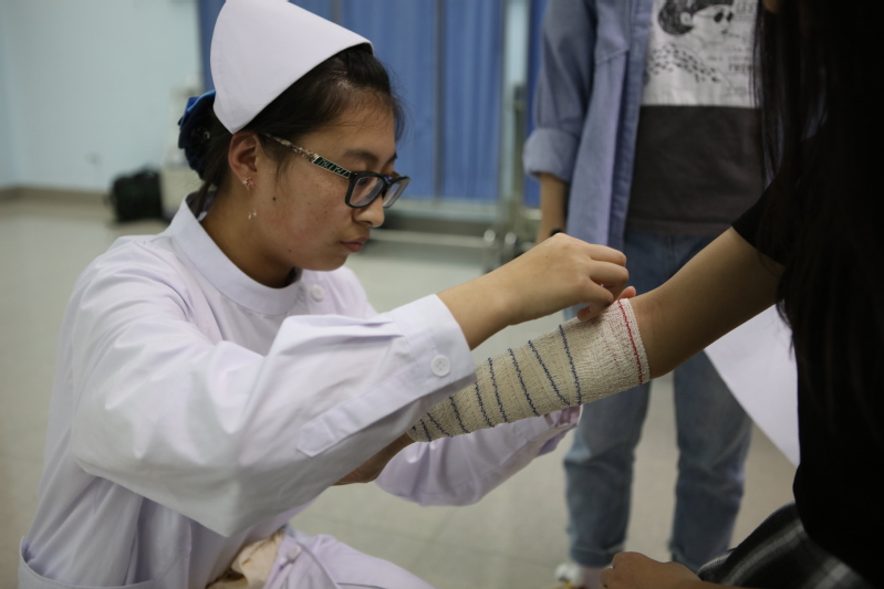 本次活动主要参赛选手由我校红十字会成员及部分护理专业同学,参赛选手以小组为单位进行竞争,共分为六个小组。主要比赛项目有:下肢骨折包扎、胸部包扎、头部包扎、上肢出血包扎、心脏复苏以及担架运输。最后由评委通过小组各组员的表现对小组进行打分评出名次。