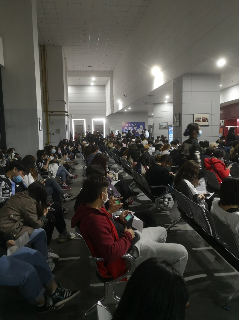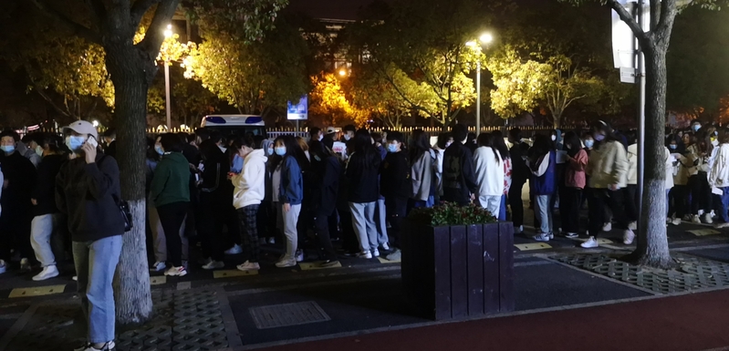 夜幕下学生有序排队等待接种