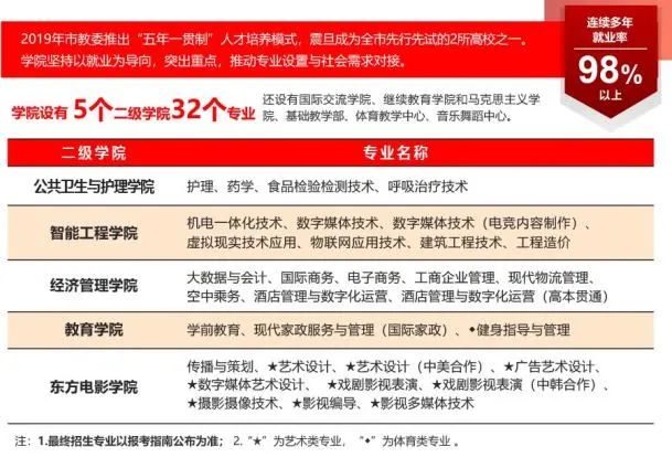 在震旦职业学院以社会需求和学生就业为导向,设置5个二级学院,开设32个专业。其中护理、药学、学前教育、健身指导与管理、机电一体化技术、虚拟现实技术应用、物联网应用技术、建筑工程技术、大数据与会计等专业,在全国2021年全国高职院校开设TOP20专业中占据11个专业,在10大新开专业也涵盖6个专业。