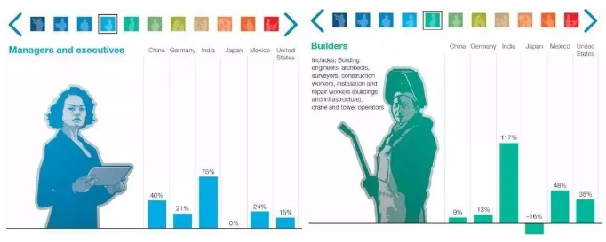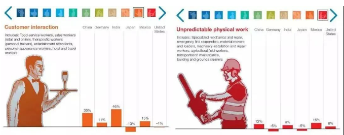 麦肯锡报告中分了11个行业大类,看不同国家未来在这些行业的岗位需求变化。其中涉及到创意工作、技术类工程师、管理类以及社会互动类的岗位需求增长明显,因为机器还无法在这些领域取代人类。另一方面,那些在可预测环境中进行物理活动的部分岗位需求将下降明显。