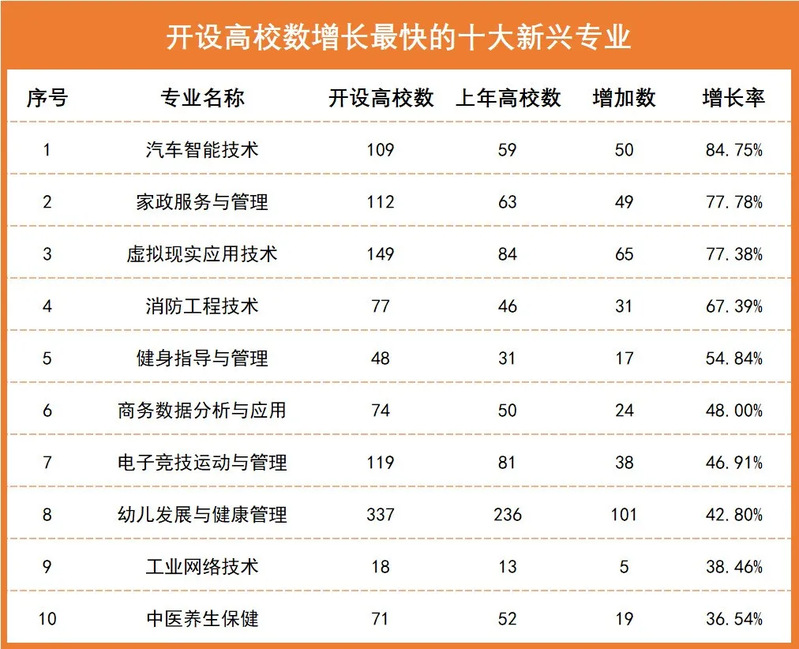 经过最新调查统计发现,汽车智能技术、家政服务与管理、虚拟现实应用技术、健身指导与管理、幼儿发展与健康管理等专业的增长热度较大,新开高校数大幅增加。另外,虚拟现实应用技术、健身指导与管理、工业网络技术、中医养生保健等专业首次进入新兴专业前十。